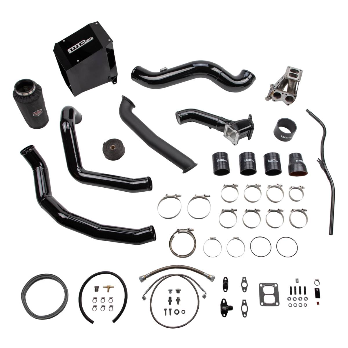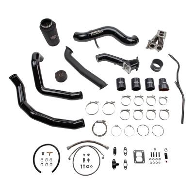 This single fixed vane turbocharger install kit from WCFab for 2001-2004 Chevy Silverado 2500 / 3500 HD trucks contains what you need to swap from your stock IHI style turbo to a larger frame Borg Warner S300 style setup on a 6.6L LB7 Duramax diesel engine. Upgrades your existing air cleaner setup to a 4" fabricated aluminum intake with heavy duty sheet metal air box and high performance dry filter with pre-filter cover. Intercooler hot and cold side charge pipe plumbing are also updated to high flow 3" diameter mandrel bent 14 gauge aluminum tubes. Includes our upgraded high flow 3" fabricated billet y-bridge kit which replaces the restrictive stock upper intake manifold to finish off the air flow path into the engine and allow for maximum horsepower and efficiency gains. Supplied Oil Lines are high-quality stainless steel braided Parker Lines with the oil feed line routing from the main oil galley on the side of the engine block. A variety of popular turbo size options (sold separately) mount to a T4 fabricated steel pedestal with spacer which is compatible with our 2" high flow stainless steel up pipes. Included high temp ceramic coated turbo downpipe connects to your existing exhaust front pipe V-Band clamp. This simplifies installation and requires NO cutting or modification to your exhaust system.
