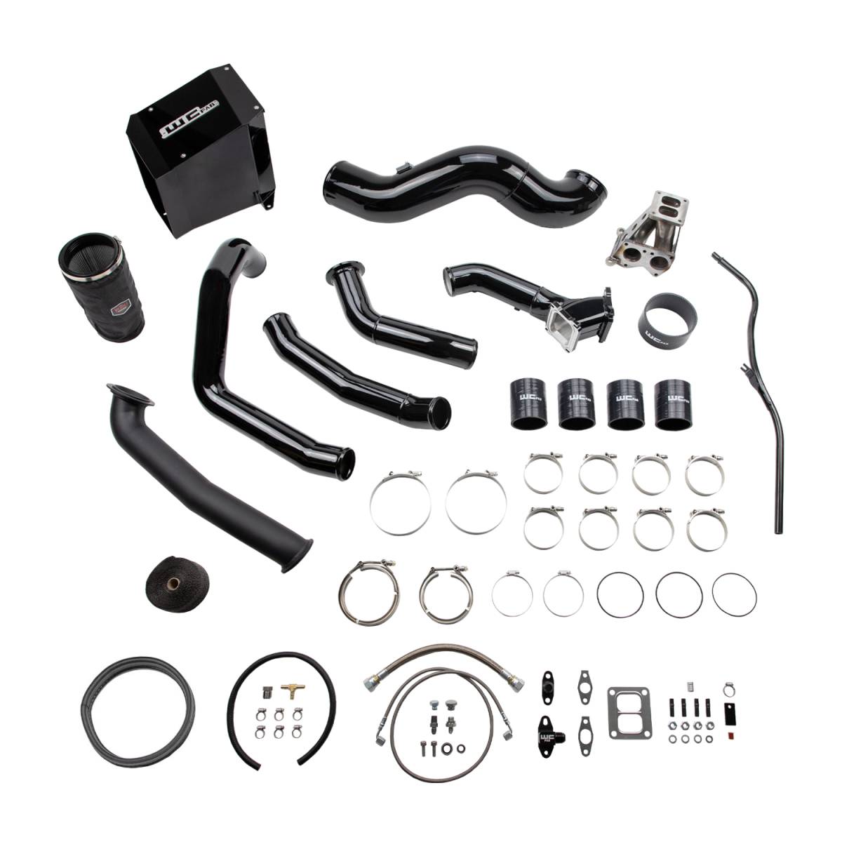 This big single turbocharger install kit from WCFab for 2001-2004 Chevy Silverado 2500 / 3500 HD trucks contains what you need to swap from your stock IHI style turbo to a larger frame Borg Warner S400 style setup on a 6.6L LB7 Duramax diesel engine. Upgrades your existing air cleaner setup to a larger 5" fabricated aluminum intake with heavy duty sheet metal air box and high performance dry filter with pre-filter cover. Intercooler hot and cold side charge pipe plumbing are also updated to high flow 3" diameter mandrel bent 14 gauge aluminum tubes. Includes our upgraded high flow 3" fabricated billet y-bridge kit which replaces the restrictive stock upper intake manifold to finish off the air flow path into the engine and allow for maximum horsepower and efficiency gains. Supplied Oil Lines are high-quality stainless steel braided Parker Lines with the oil feed line routing from the main oil galley on the side of the engine block. A variety of popular turbo size options (sold separately) mount to a T4 fabricated steel pedestal with spacer which is compatible with our 2" high flow stainless steel up pipes. Included high temp ceramic coated turbo downpipe connects to your existing exhaust front pipe V-Band clamp. This simplifies installation and requires NO cutting or modification to your exhaust system.