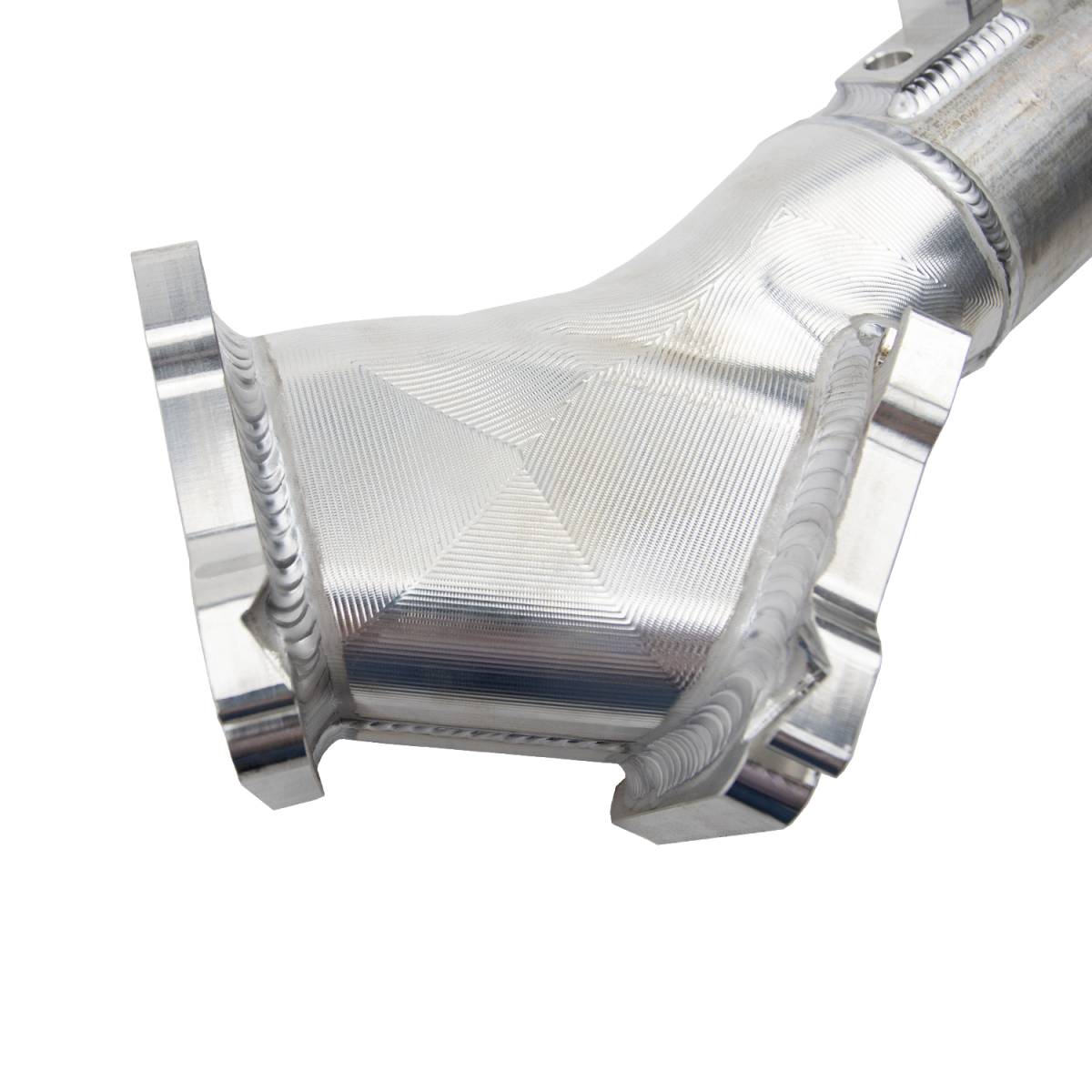We move on to the high-flow Y bridge, one of the nicest components of the whole kit. This replaces the very, very restrictive OEM Y bridge. The factory bridge measures about two and three-eighths of an inch. We have a full three-inch high flow bridge, mandrel 14 gauge aluminum on the top section into a billet aluminum CNC machine, lower section. So this bridge is phenomenal compared to the factory, be it a full three-inch track the whole way on the flow bench.