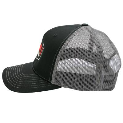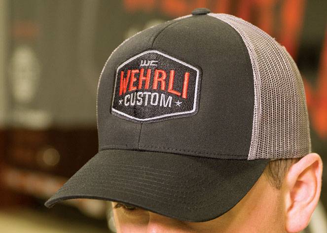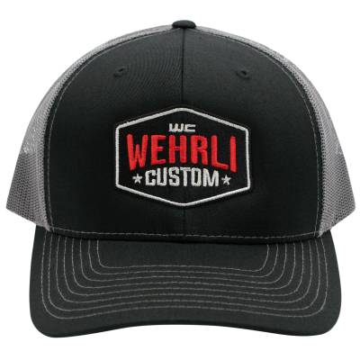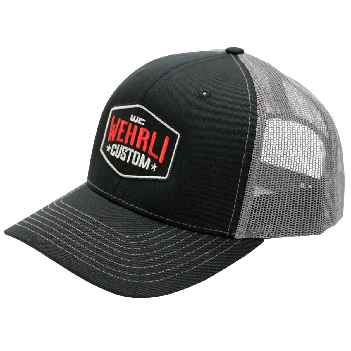 Snap Back Hat with Mesh back. Black bill with charcoal back, embroidered Wehrli Custom Badge Logo.