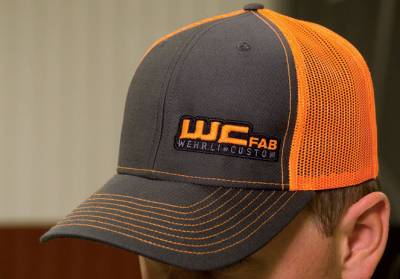 Snap Back Hat with Mesh back. Charcoal/Neon Orange, embroidered WCFab Logo.