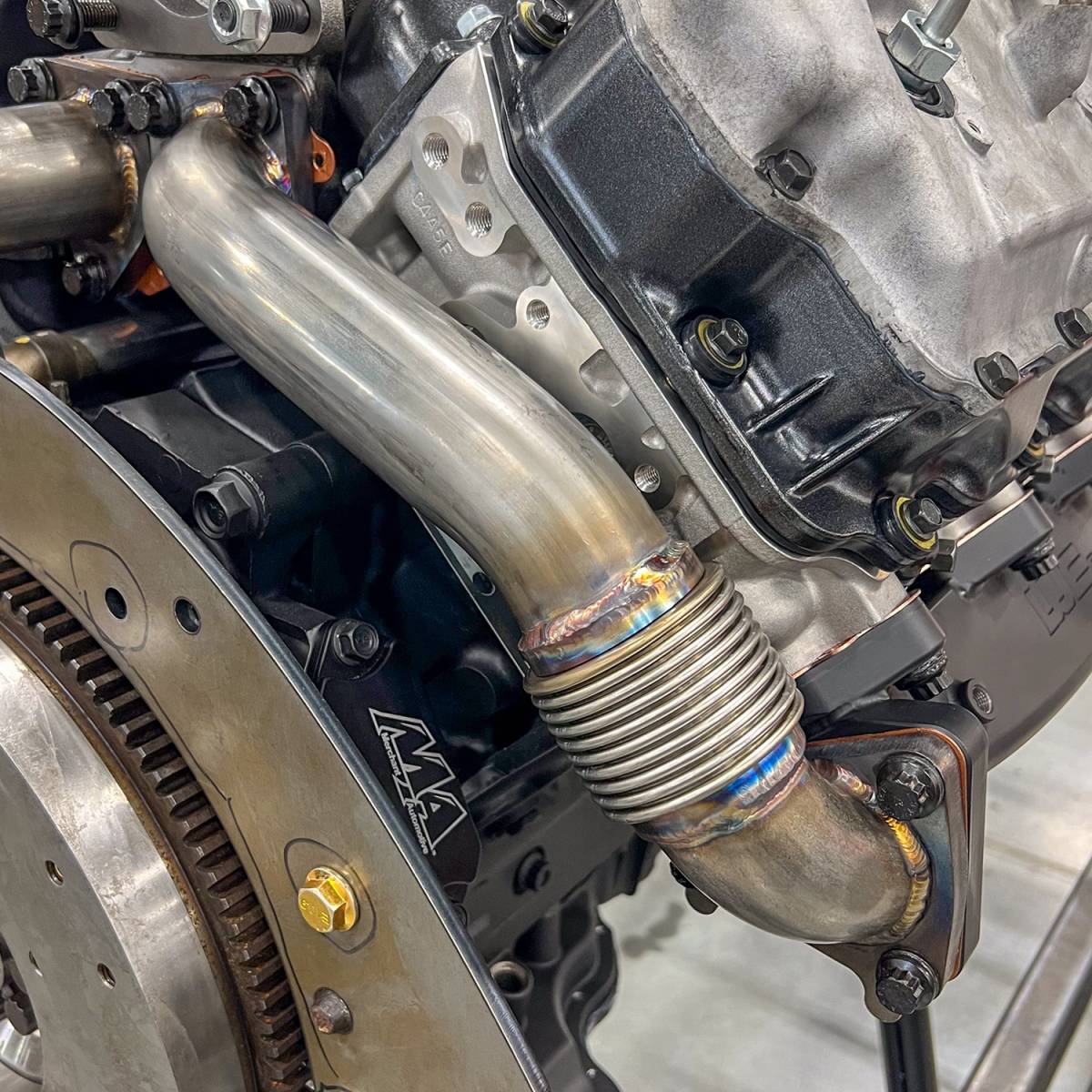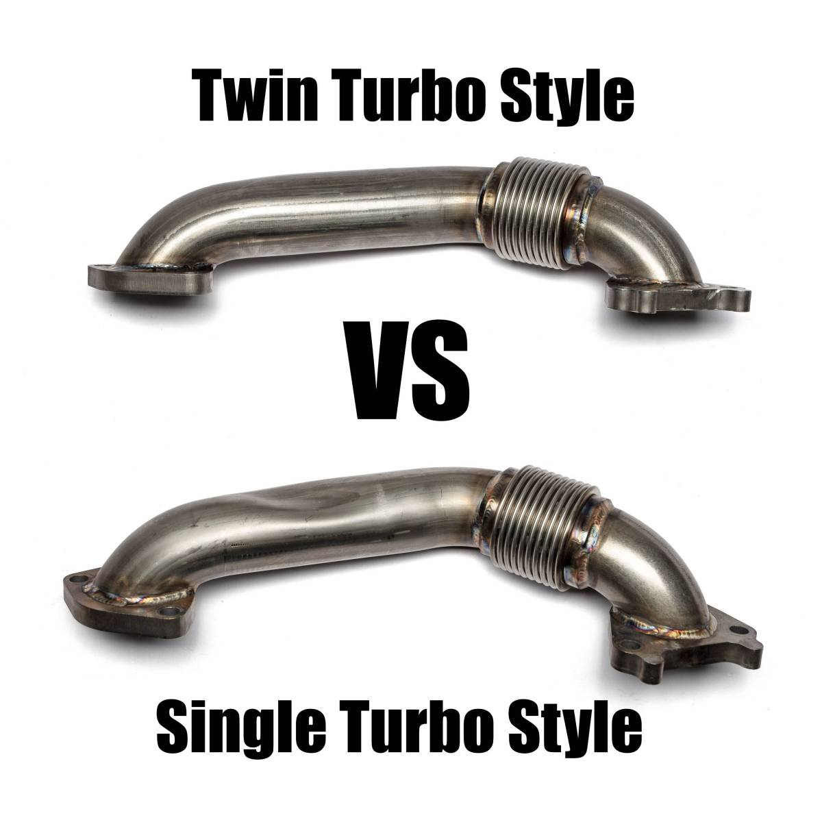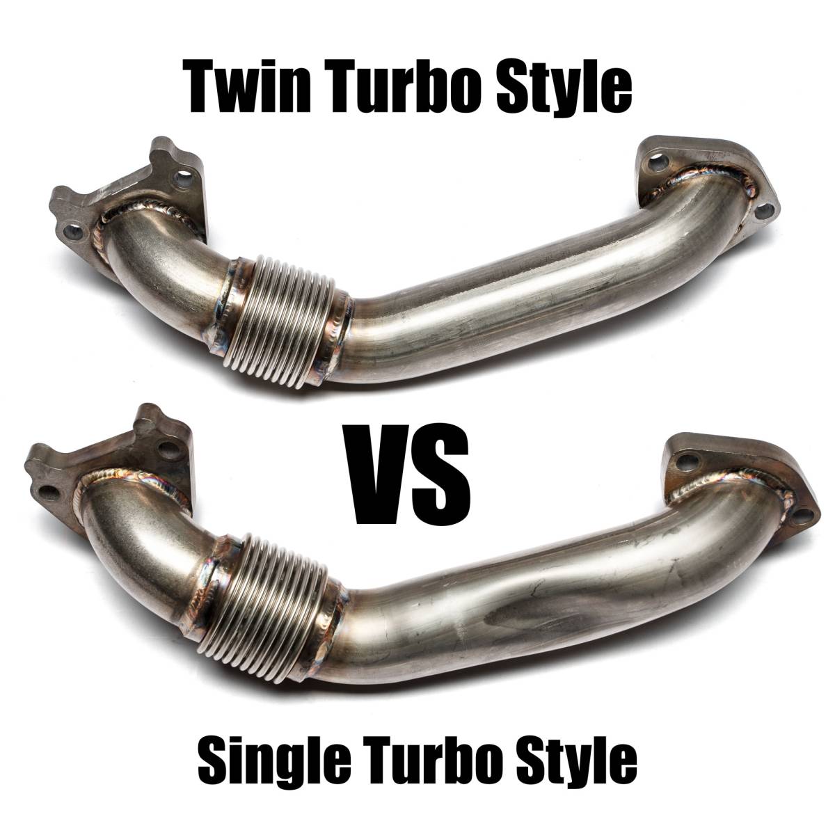 Replace the lightweight, leak-prone passenger side OEM up pipe with this heavy-duty 11 gauge 2" Stainless up pipe. HD Stainless Bellows that will not crack and leak like OEM. Increase Turbo spool-up and decrease EGTs. This up pipe is built with more sweeping, less aggressive bends for use in TWIN TURBO STYLE APPLICATIONS ONLY. It WILL NOT clear a conventional downpipe behind the engine.