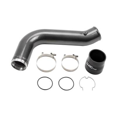 The WCFab 3.5" High Flow Passenger (Cold) Side Intercooler Pipe for 2017-2019 L5P 6.6L Duramax equipped Chevrolet Silverado or GMC Sierra 2500 / 3500 HD truck replaces the factory plastic two piece pipe with a high flow, 14 ga. aluminum one piece 3.5" pipe.
