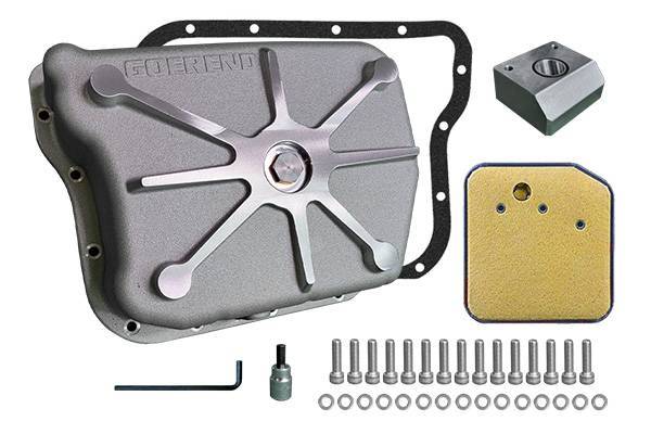 Manufactured by Goerend Transmission, this 47/48RE transmission pan is constructed of lightweight cast-aluminum for efficient heat dissipation, durability, and holds 2.5 quarts more fluid than OE. The patented sloped floor design results in 100% drainage, yet has a flat bottom for easy installation. The magnetic drain plug catches any possible worn gear material, keeping the fluid at its best while creating a leak proof seal. The drain plug also uses a 1” socket for easy removal and is designed not to strip. Goerend's 47/48RE transmission pan includes an o-ring seal with the billet lowering block to position the filter in optimum position.