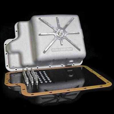 The Goerend 5R110 transmission pan is constructed of lightweight, cast-aluminum for efficient heat dissipation, durability, and holds approximately three quarts more fluid than the OE version. The patented, sloped floor design results in 100% fluid drainage, while the magnetic drain plug catches and eliminates debris from circulating throughout the transmission. The copper sealing ring provides a leak-free seal. The drain plug also uses a 1" socket for easy removal & is designed not to strip.