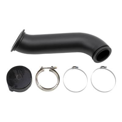 4" Turbo Down Pipe for Cummins with High Mount style turbo on 2nd Gen style exhaust manifold. The upper flange measures 4" diameter to mate with S300 exhaust housing. The lower flange connects to the factory exhaust system v-band flange using the OEM v-band clamp. This down pipe is high-temperature ceramic coated and includes heat wrap with clamps and a 3.5" V-band Clamp for turbo connection. Also compatible with 2003-2004 model year trucks which have updated their exhaust system front pipe to the 2004.5-2007 style part.