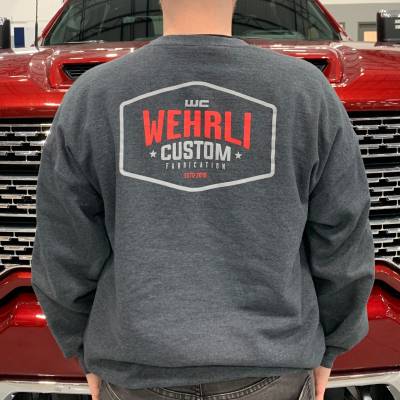 Pullover Crewneck Sweatshirt with large Wehrli Custom Badge Logo on the back and small WCFab logo on right chest.