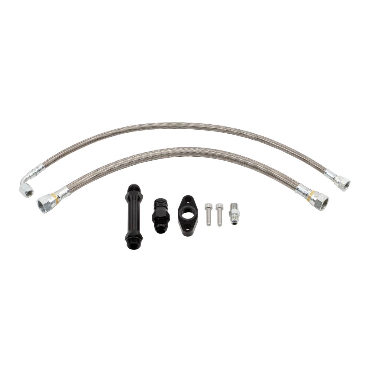 Cummins High Mount 2nd Gen Swap Oil Feed and Drain Line Kit, with extended oil drain fitting assembly. Teflon lined stainless steel braided #6 feed and #10 drain lines.