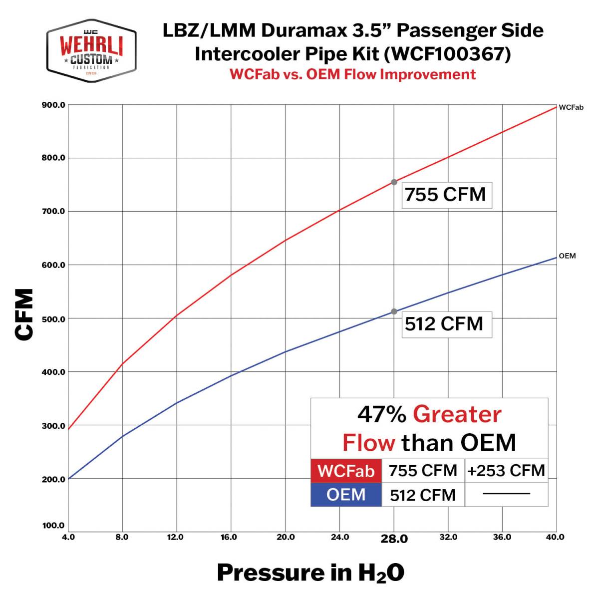 The 3.5" High Flow Passenger (Cold) Side Intercooler Pipe Kit for 2006-2010 LBZ/LMM Duramax replaces the failure prone factory plastic piece with a larger, high flow, 14 ga. aluminum fabricated 3.5" pipe. This part uses CNC machined flanges with double o-ring seals, comes supplied with a new wire clip rings for both slip flanges, and uses an upgraded silicone hump boot with stainless steel t-bolt clamps to withstand higher boost pressures than the factory components to increase reliability and eliminate blown factory boots and horsepower robbing boost leaks. Finished in your choice of custom powder colors. This pipe is compatible with stock trucks requiring no additional modifications, upgrades, or tuning for installation.