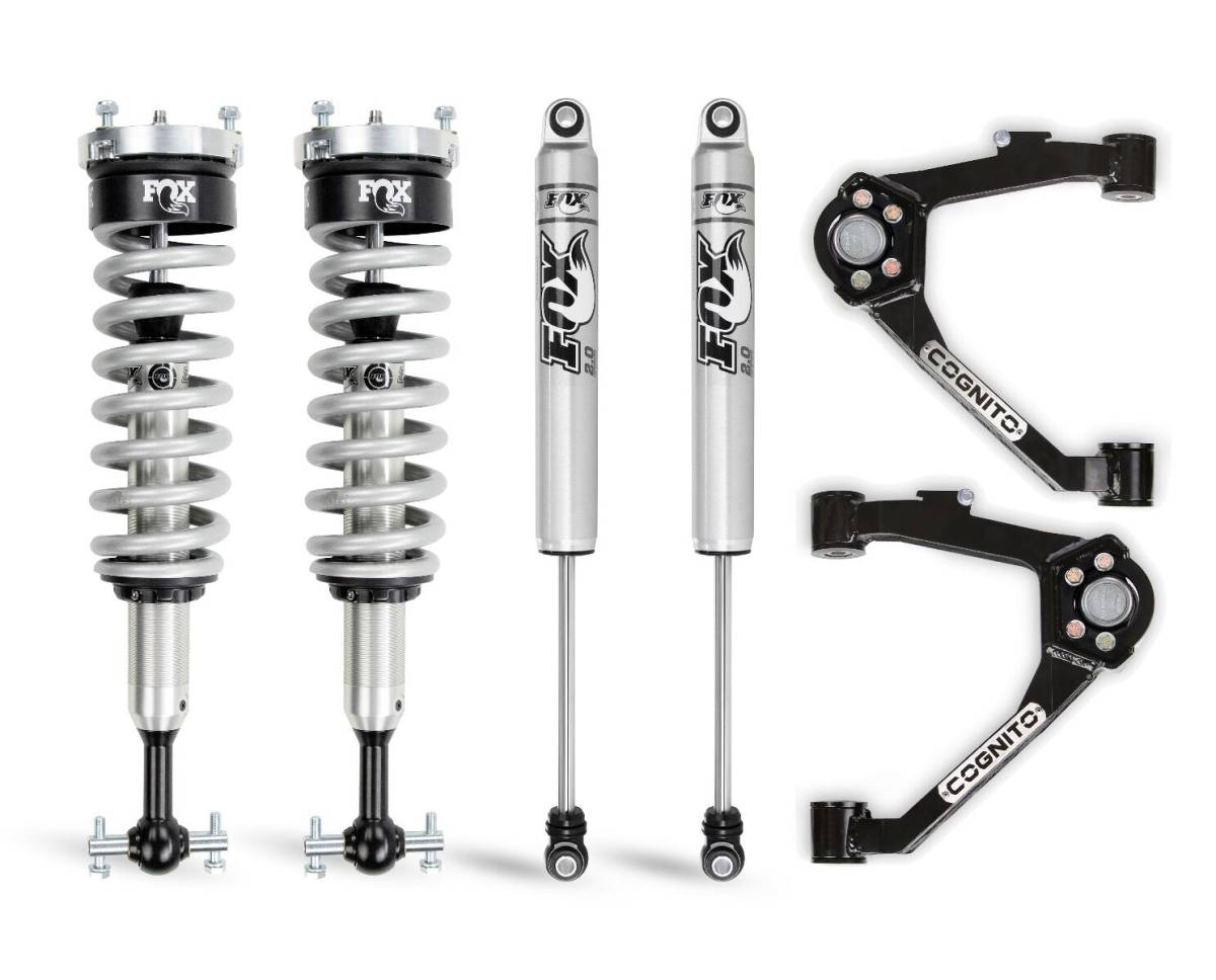 We have bundled everything you need in a leveling kit for your Silverado/Sierra 1500 2WD/4WD with high quality Cognito components. There is no guesswork. Cognito components are engineered, manufactured, and assembled in the USA. The Cognito 3-inch Performance Ball Joint Leveling Kit includes the Cognito Ball Joint SM Series Upper Control Arm Kit, Fox Performance Series Coilover front shocks and Fox Performance Series Monotube rear shocks with hardware included.