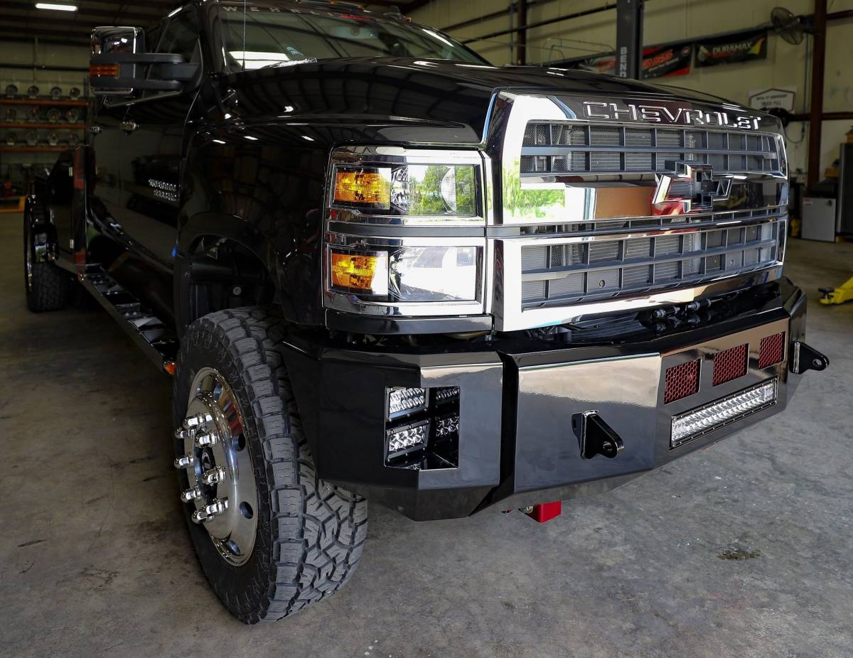 This bumper is designed for 2019 and newer Silverado 4500/5500/6500 trucks. The 3 piece design allows for dozens of possibilities for customizing the color scheme to the truck and other accessories. The bumper has a main center section along with a pair of end caps or 'wings'. These outer pieces are available in a wide version to allow you to finally have your bumper match up to the beefy front end on these trucks. The Bravo Series Bumper is a low-profile design that still provides protection for your truck. Light cutouts allow you to run optional LED light bars to see the road ahead. The standard designcan run (2) 4" light bars horizontally in the bumper 'wings'. The center section of the front bumper features a cutout for a 20" dual row light bar. If you're looking for further functionality from your bumper, check out the optional clevis hook mounts. These high-strength, hand-welded mounts allow for a tow point to get you out of trouble. Clevis hooks are sold separately. Integrated mesh sections in the front bumper allow for the necessary airflow to your engine and an additional piece that can be customized. Bumper, lights, hooks, and other accessories are sold separately. This bumper is also compatible with the International CV models.