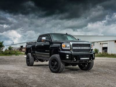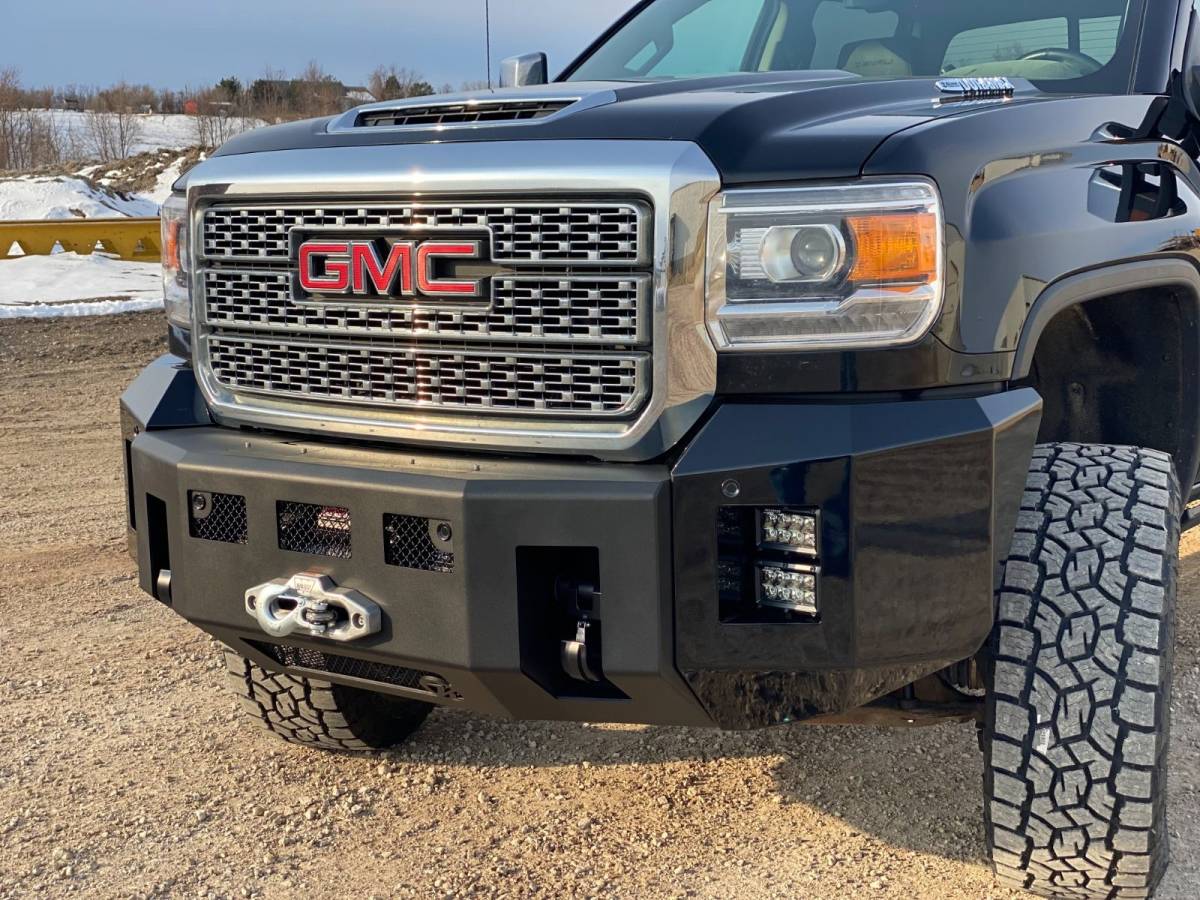 Known as the premier name in air suspension systems for 3/4 ton and larger trucks for over 25 years, Kelderman Manufacturing is proud to announce our all-new lineup of three-piece, modular bumpers for heavy-duty trucks. This bumper is designed for the 2015-2019 Sierra 2500 or 3500HD trucks. This 3 piece design allows for dozens of possibilities for customizing the color scheme to the truck and other accessories. The bumper has a main center section along with a pair of end caps or 'wings'. These outer pieces are available in multiple widths to allow you to finally have your bumper match up to either the stock fender or an aftermarket fender flare. If you are not running wider fender flares on the truck, a stock width option will match up to the factory fender. If you want to make sure your bumper doesn't stick out like a sore thumb next to a set of wider fender flares, just go for the 'Wide' version of the bumper. The Kelderman front bumper is also built with a unique set of 'pockets' that allow for easy mounting of clevis hooks, tow ropes, etc. This front bumper is available in a winch configuration or with a light bar cutout. The standard design can run (2) 4" light bars horizontally in the bumper end caps. The available winch bumper can accept up to a WARN 16.5ti winch setup to make sure you can fit a winch capable of pulling a full size truck and all your gear out of trouble. Integrated mesh sections in the front bumper allow for the necessary airflow to your engine and an additional piece that can be customized. Bumper, lights, hooks, other accessories sold separately.