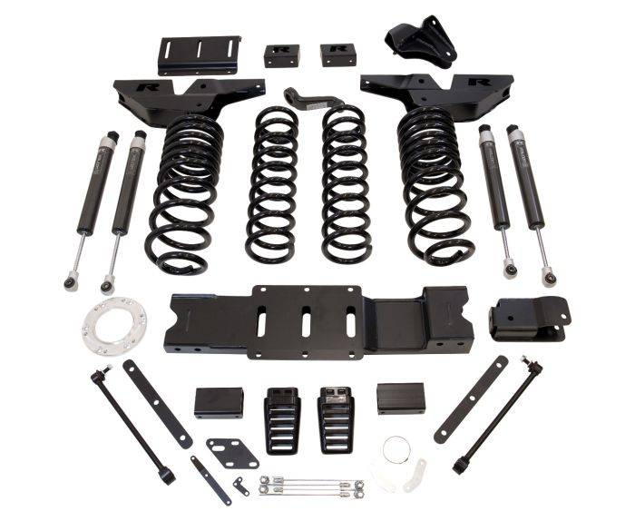The 49-19610 is specifically designed for Ram Heavy Duty applications with proprietary front and rear coil springs, heavy-duty radius arm drop brackets, heavy-duty fabricated steel front and rear track bar brackets, forged dropped pitman arm, front/rear sway bar relocation brackets and bump stop extensions preventing over-compression of the new Falcon 1.1 Monotube front & rear shocks that are included in this premium kit. This kit includes a unique CNC-machined 6061-T6 billet Aluminum Driveline Indexing System (DIS) that re-clocks the transfer case aligning the front output shaft for improved driveline angles. Some Ram HD trucks can experience a slight vibration after lifting due to driveline angle sensitivity. ReadyLIFT 6 in. lift kit with the Drive Line Indexing System (DIS) addresses this condition by re-clocking [indexing] the transfer case and providing a stout heavy-duty steel cross member that accommodates the new T-case position, all resulting in a smooth driving experience on or off-road.