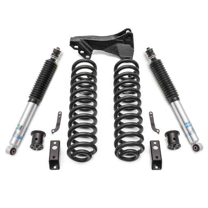 ReadyLIFT Suspension now offers a 2.5" Lift Coil Spring Front leveling Kit made to fit 2011-2016 Ford Super Duty F250/F350 trucks complete with Bilstein shocks and our popular front track bar relocation bracket. This gives Super Duty owners an excellent alternative for lifting the front of your truck. This great new front leveling system will raise the front of your 2011-2016 4WD Super Duty truck 2.5" while including added value components such as the premiere Bilstein shocks and a track bar relocation bracket. The 46-2727 coil spring system allows for increased tire sizes and widths along with providing improved ground clearance and a more commanding view of the road. This premiere leveling kit easily allows for 35" tall tires.