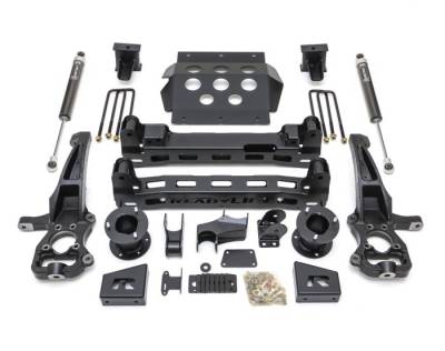The 44-39605 lift kit utilizes the very best in ReadyLIFT engineering with boxed steel front/rear cross members and full-width front skid plate constructed of thick 3/16" plate steel. New 1/4-inch boxed plate steel differential drop brackets feature a double gusset and boxed center rib to take the abuse of front differential torsional twisting. This 6" lift kit features heavy-duty angled and offset top mount strut extensions that realign the struts to optimize shock performance and minimize wear. A specially designed lower mount strut pre-load spacer offers the added benefit of a slight increase in spring rate to better handle the larger wheels and tires that will find their way onto this new lifted truck. To lift the rear, new 5" tall fabricated steel rear blocks with integrated bump stop landings have been added as well as new Falcon 1.1 Monotube rear shocks.