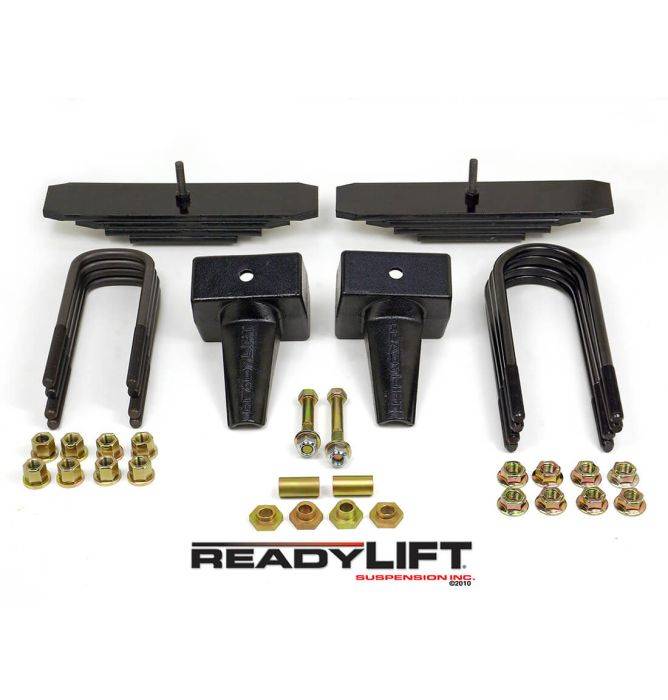 These front leaf spring trucks require an innovative approach to leveling-lifting. ReadyLIFT is proud to offer an SST Lift Kit system that will compliment the leaf spring suspension. This system includes a "mini leaf pack" that, once installed under the factory leaf spring pack, raises the front of the 4WD Super Duty trucks a total of 2.0" which is what is required to obtain a level stance. To lift the rear, their time-tested OEM-style 4.0" cast iron rear blocks with built-in pinion angle correction and bump stop landings replace the factory 2.0" block for additional lift of 2.0". This set up establishes a mild lift with a slight rake maintained for towing or hauling. The kit comes with new longer front and rear U-bolts and hardware as well as important pan-hard bar alignment bushings.
