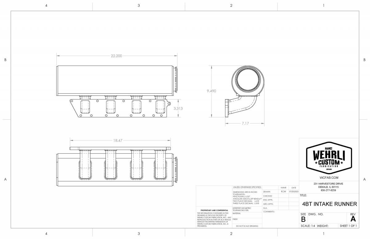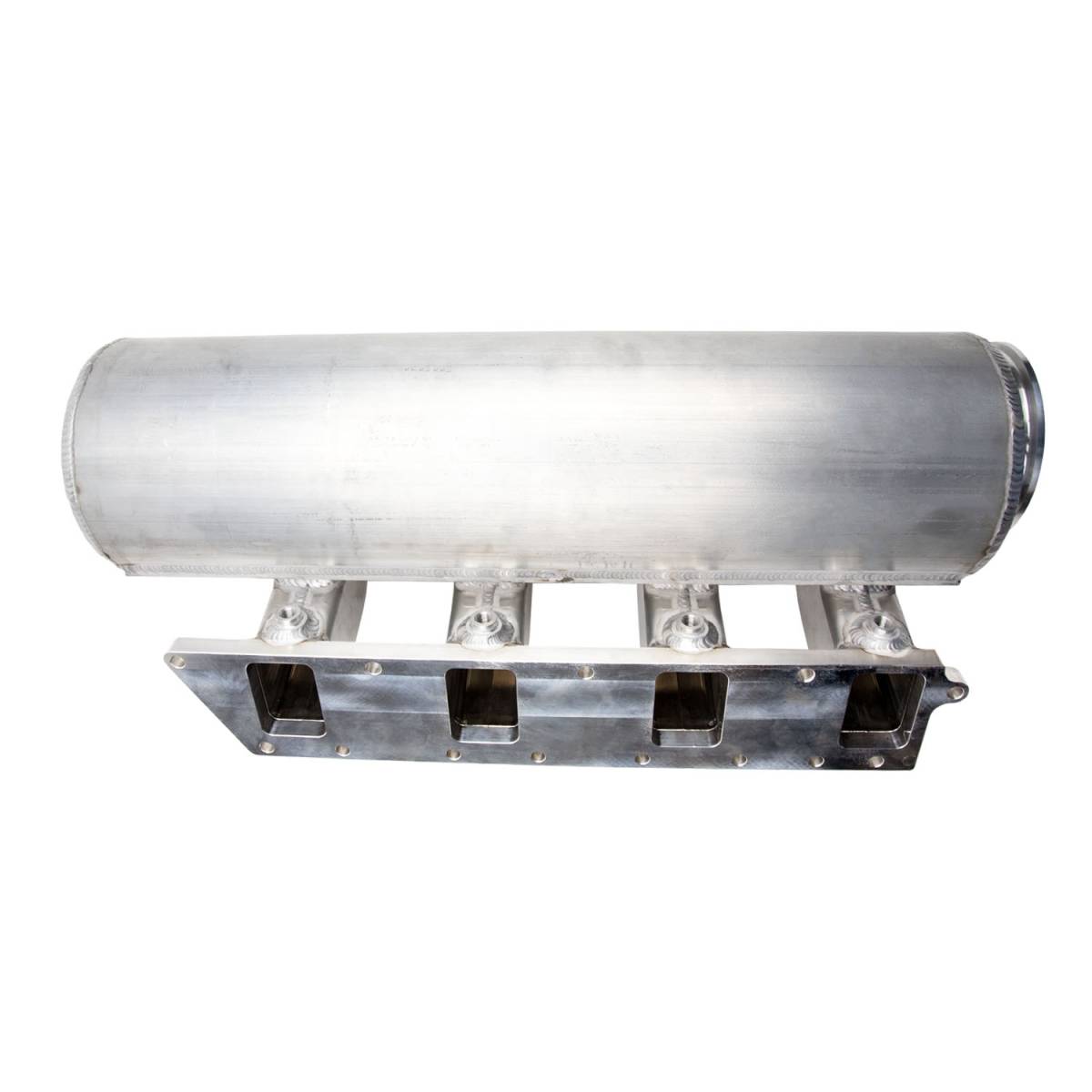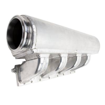 The WCFab Billet Individual Runner Intake for 4BT Cummins engines features a massive, custom fabricated aluminum intake plenum and high flow precision CNC machined tapered individual intake runners to provide significantly increased airflow and more balanced distribution to all cylinders. Designed for extreme performance drag racing and pulling engines with extensive cylinder head machining work looking to maximize engine volumetric efficiency and high RPM power output. Requires custom fuel injection lines and intercooler piping, milling off the cast intake shelf, and mounting holes drilled and tapped in the cylinder head for installation.