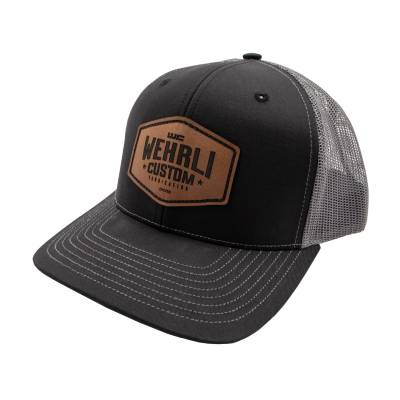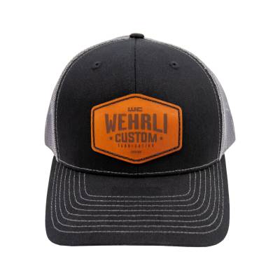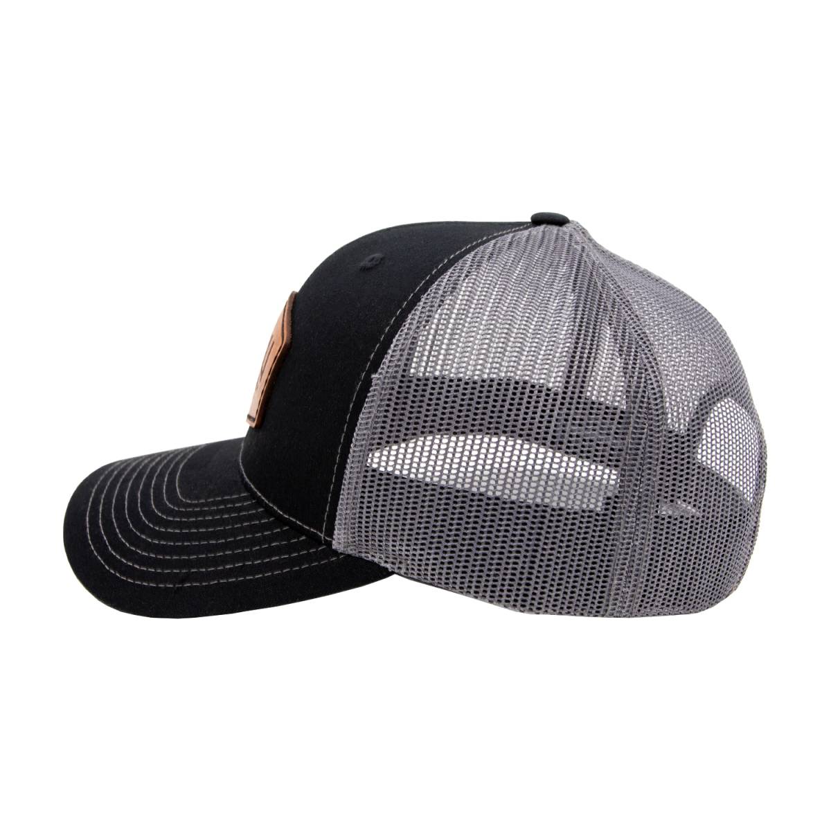 Snap Back Hat with Mesh back. Black bill and Grey back Color, Brown leather WCFab badge logo.
