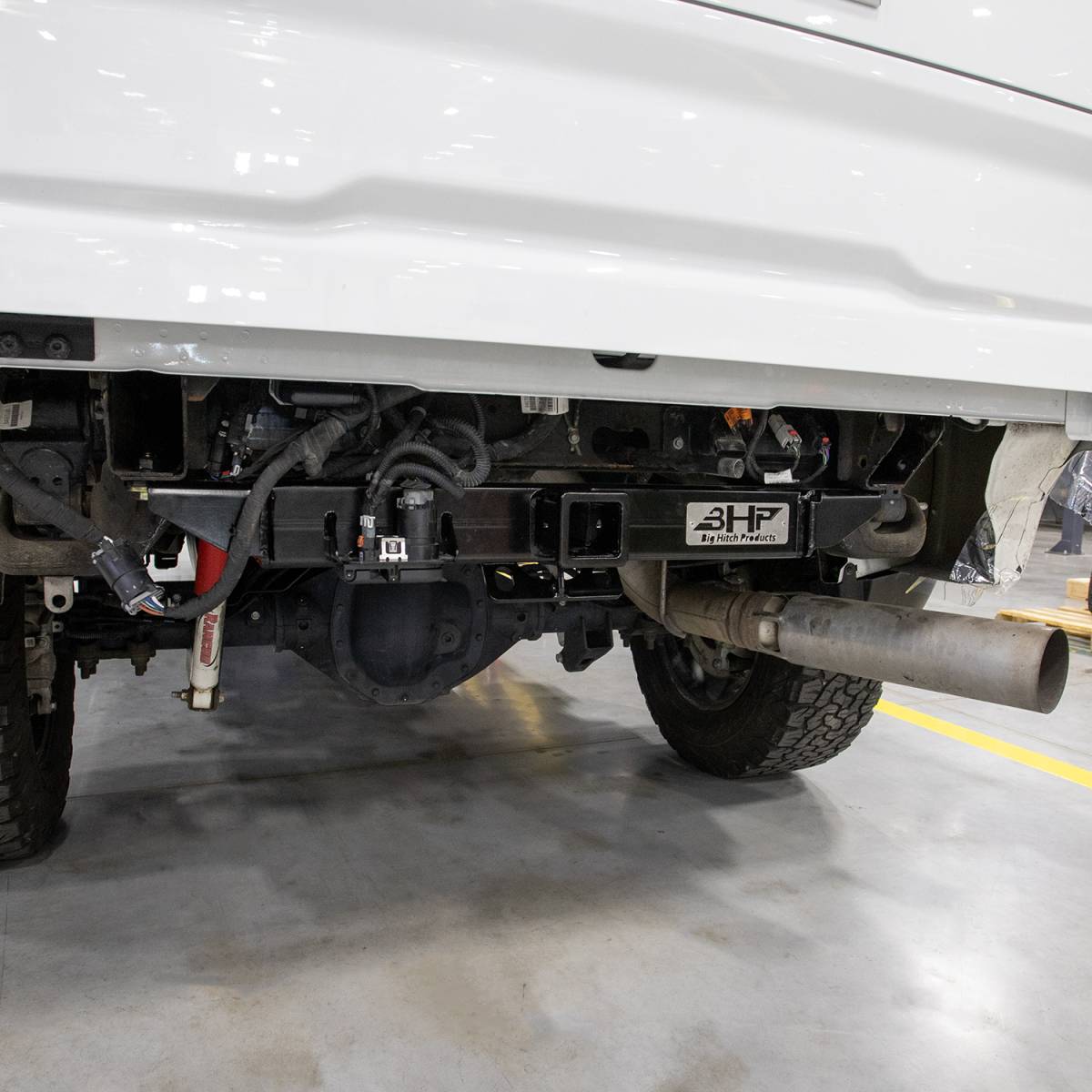 If you don't install one of these style receivers, your factory receiver hangs too low and too far out from the rear of the truck, becomes a knee buster and just doesn't look right with a roll pan installed. So with the behind roll pan creates a nice clean look on the rear of the vehicle. We offer our flip up and slide in style license plate holders. You can either remove or flip up that license plate, install your two and a half inch hitch and hook right up to that trailer and still be able to haul stuff with your HD pickup truck. Two different versions offered. As I mentioned, we have the one that's hidden completely directly behind the roll pan. And then we also offer our below roll pan style a little bit different. Look, the hitch is quite a bit lower than factory but does make it easier to install and remove that hitch BHP hitches are 100% made here at BHP in DeKalb, Illinois.