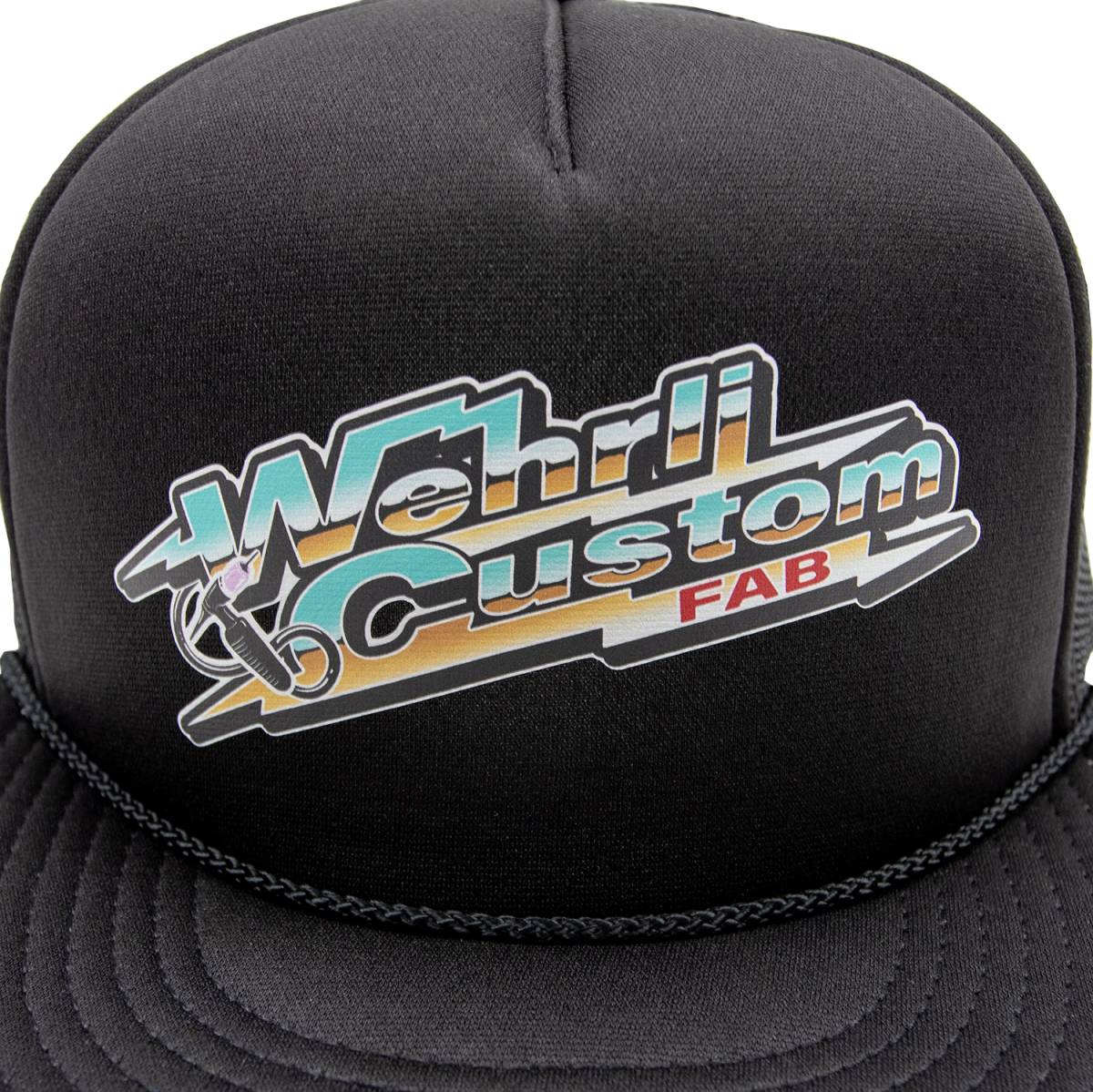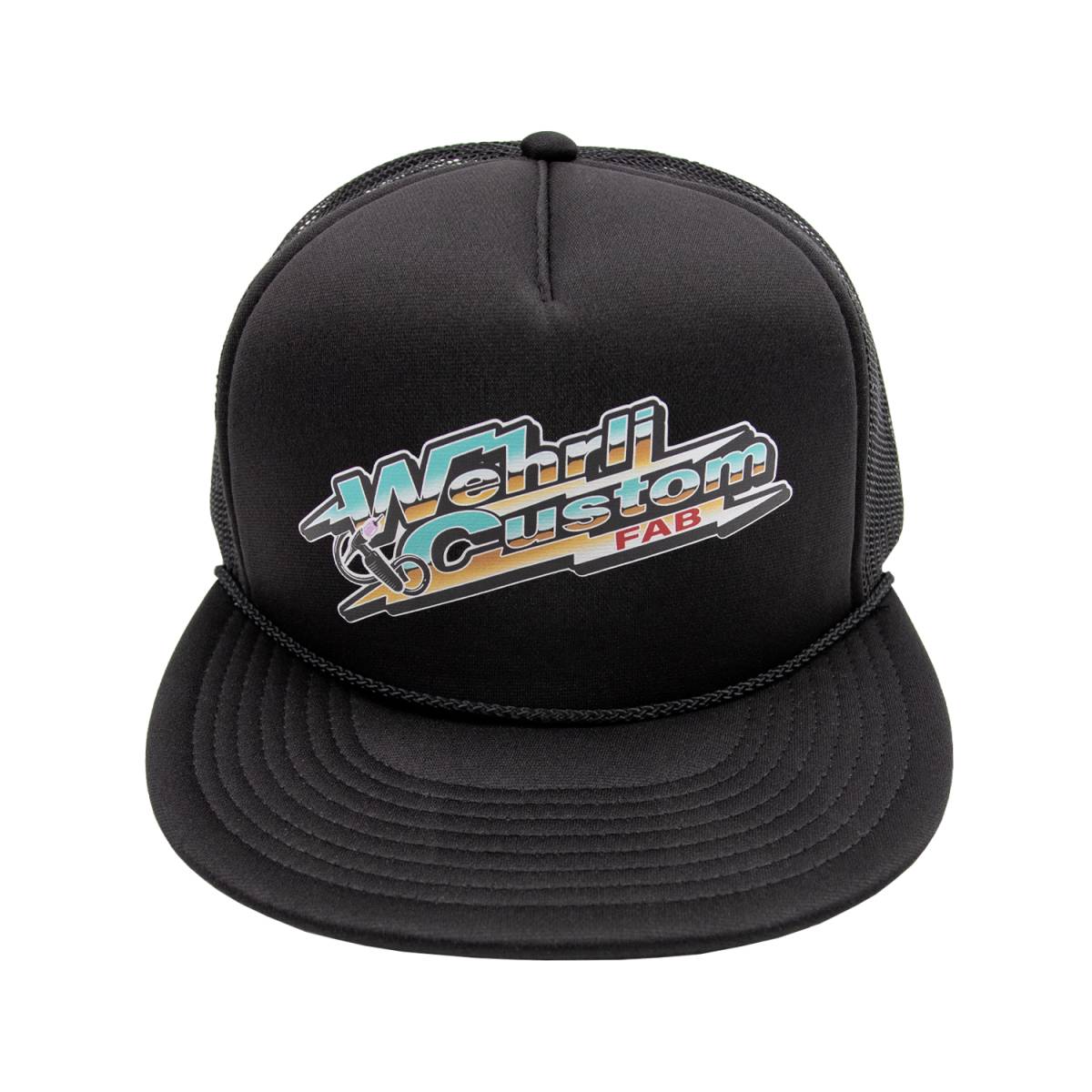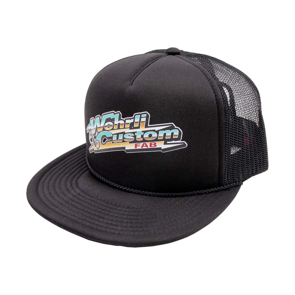 Snap Back Hat with Mesh back. Black bill and back color, retro chrome WCFab logo.