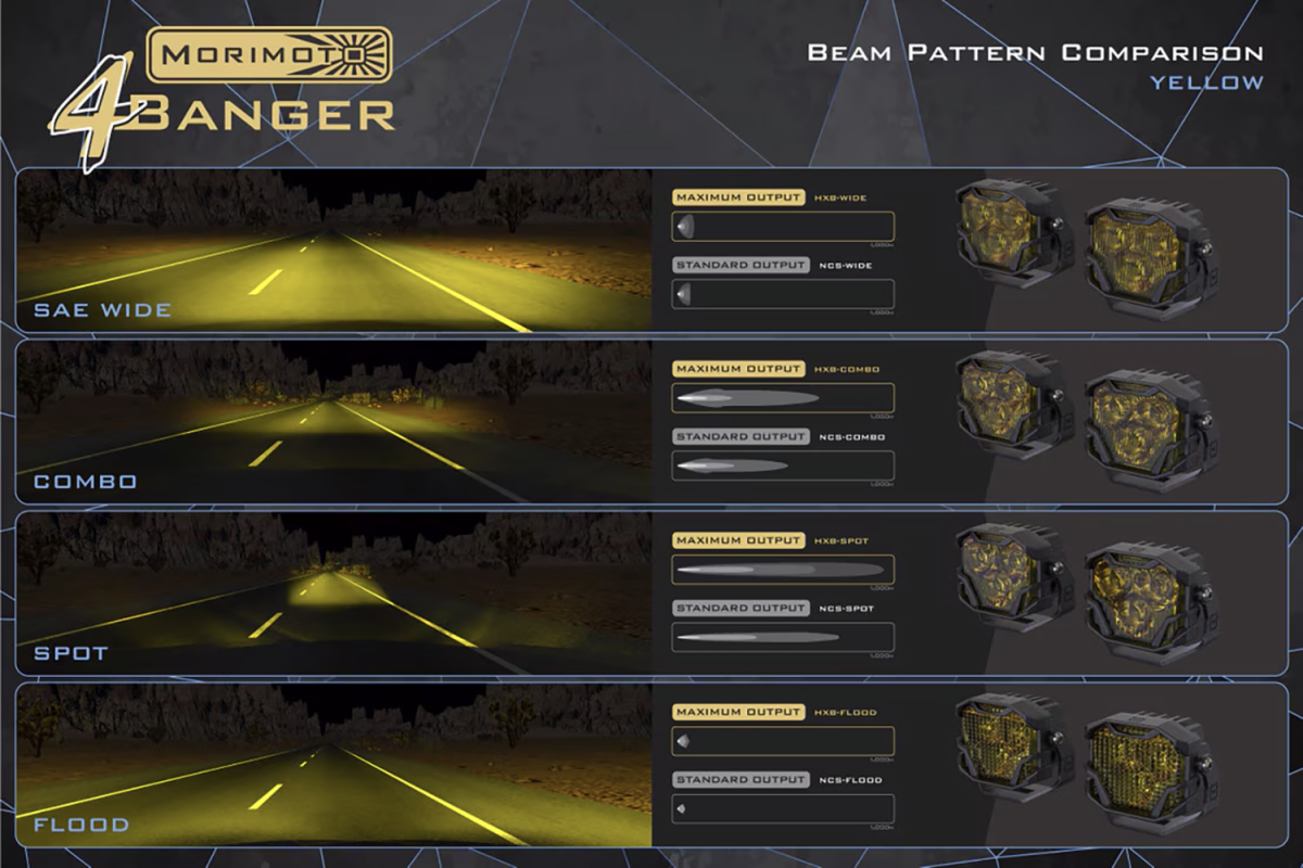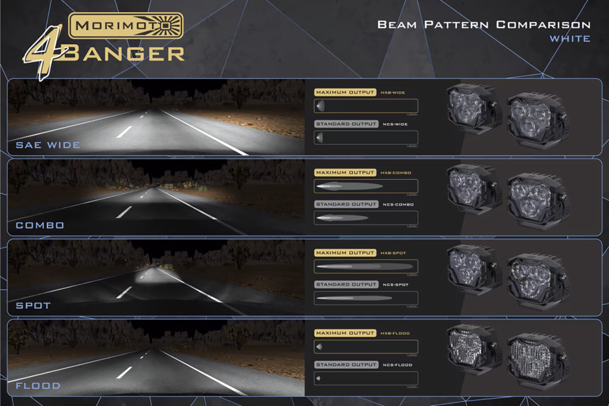 HXB Combo Beam: Illuminates a clear path with medium range. The HXB Combo beam provides a blend of width and distance illumination making every day driving in the middle of nowhere far more comfortable. The 8H x 4V oval hot spot with a 10V degree spread at beam center has been perfectly tuned to produce an ideal flood beam. The 4Banger HXB Combo is an excellent aid to any set of high-performance headlights.