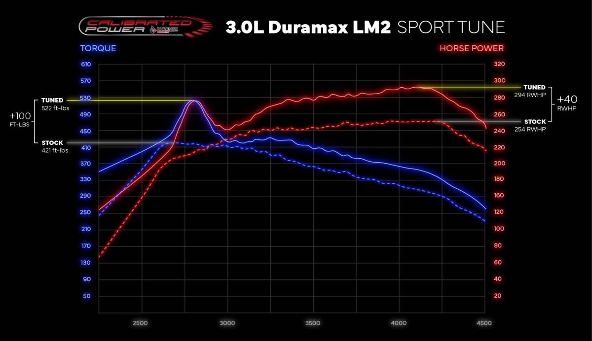 Calibrated Power custom tuning is exactly what the LM2 needs to wake it up and unlock its true performance potential. Combining the engine tuning with T93 Transmission tuning is the ultimate way to match your transmission holding capacity, shift schedule, and torque converter clutch engagement to the new found torque of your 3.0L Duramax allowing it to lug like a diesel. LM2 ECM Unlock Service, ECM Tune, TCM Tune, Hardware and Credits included.